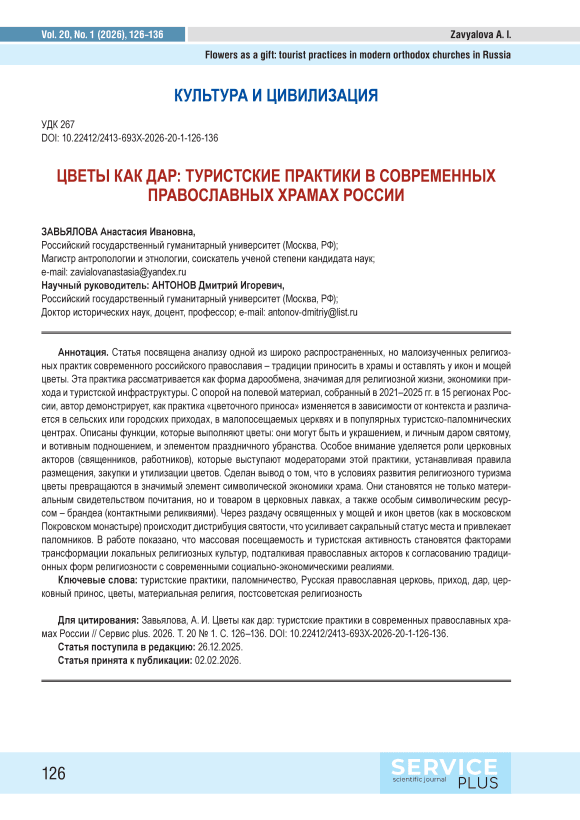 Статья посвящена анализу одной из широко распространенных, но малоизученных религиозных практик современного российского православия – традиции приносить в храмы и оставлять у икон и мощей цветы. Эта практика рассматривается как форма дарообмена, значимая для религиозной жизни, экономики прихода и туристской инфраструктуры. С опорой на полевой материал, собранный в 2021–2025 гг. в 15 регионах России, автор демонстрирует, как практика «цветочного приноса» изменяется в зависимости от контекста и различается в сельских или городских приходах, в малопосещаемых церквях и в популярных туристско-паломнических центрах. Описаны функции, которые выполняют цветы: они могут быть и украшением, и личным даром святому, и вотивным подношением, и элементом праздничного убранства. Особое внимание уделяется роли церковных акторов (священников, работников), которые выступают модераторами этой практики, устанавливая правила размещения, закупки и утилизации цветов. Сделан вывод о том, что в условиях развития религиозного туризма цветы превращаются в значимый элемент символической экономики храма. Они становятся не только материальным свидетельством почитания, но и товаром в церковных лавках, а также особым символическим ресурсом – брандеа (контактными реликвиями). Через раздачу освященных у мощей и икон цветов (как в московском Покровском монастыре) происходит дистрибуция святости, что усиливает сакральный статус места и привлекает паломников. В работе показано, что массовая посещаемость и туристская активность становятся факторами трансформации локальных религиозных культур, подталкивая православных акторов к согласованию традиционных форм религиозности с современными социально-экономическими реалиями.