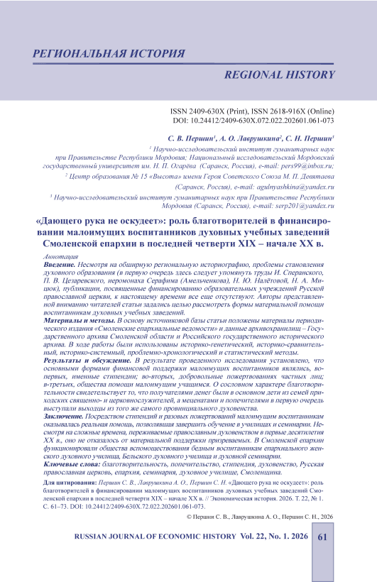 «Дающего рука не оскудеет»: роль благотворителей в финансировании малоимущих воспитанников духовных учебных заведений Смоленской епархии в последней четверти XIX – начале XX в.