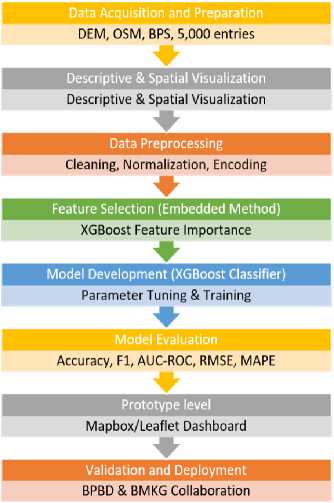 The structure of this paper is organized as follows. Section 2 reviews the literature and previous studies focusing on the integration of artificial intelligence and geospatial analysis for disaster risk reduction. Section 3 describes the research methodology, including data collection, preprocessing, feature selection, and model development using the XGBoost algorithm. Section 4 presents the experimental results and model performance evaluation based on both regression and classification metrics, accompanied by visual interpretation, model validation, and the implementation of a web-based prototype as a decision-support system for tsunami evacuation planning. Finally, Section 5 provides the conclusion, summarizing the main findings, discussing the study’s limitations, and outlining recommendations for future research and development.