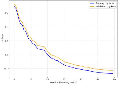 Fig. 4. compares the training and validation log loss curves of the XGBoost model over 60 boosting rounds. The curves have a downward slope in train and summaries sets which shows model continues to learn by reducing the prediction error with increasing number of boosts. At first, for both curves the log loss becomes higher and then it decreases constantly and stabilizes at around 40 iterations.