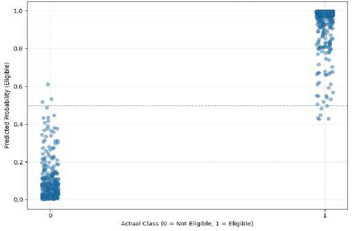 Fig. 5. Actual vs Predicted Scatter Plot. The plot demonstrates the correlation between observed ground-truth label (x-axis) and the predicted probabilities of being “ Eligible ” (y-axis). Real class 1 points cluster near high probabilities( ≈ 0.8 – 1.0), and real class 0 points concentrate near low probabilities ( ≈ 0.0 – 0.2). The dashed line in 0.5 indicates the decision threshold, showing a clear separation and well-calibrated probabilities generated by XGBoost classifier. These results demonstrate the robustness and fairness of the model, which endorses it application in real-world analysis of tsunami preparedness [4].