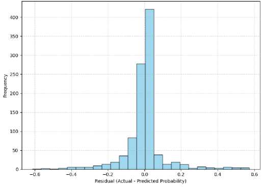 Fig. 6. Is residual distribution histogram for XGBoost model, residuals are actual binary values minus the predicted probabilities. From the histogram, we can see that majority of the residuals are centered around zero, meaning that there is a close match between the predicted probabilities and actual class labels. This behaviour is indicative of well-calibrated and unbiased model predictions.