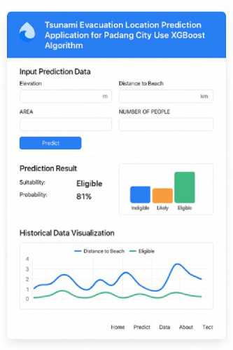 The findings of this study have practical significance for urban planning and disaster management, particularly the Padang City Disaster Management Agency (BPBD). The introduced web-based tsunami evacuation prediction program, formulated from a set of a data-driven classification model based on XGBoost, operates as an intelligent decision support system helping to make spatially explicit disaster countermeasure plans. By considering significant geospatial factors including Elevation (m), Distance to Beach (km) and, Population Density; the system offers a dynamic view toward evaluating and visualizing adequacy of an evacuation shelter in real time. The integration makes evidence-based spatial planning possible, enabling users to simulate an ever-growing number of evacuation scenarios, assess the feasibility of sites in different circumstances and constantly improve city evacuation master plans with data-driven learning.