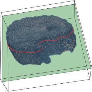 For the XPCT procedure, the OB sample was preliminarily fixed in formalin, then dehydrated and embedded in paraffin blocks. Then the sample was imaged using XPCT, resulting in a series of 2461 X 2461 2D tomographic slices [13]. We denote the original dataset, presented in paper [13], as D = {S i } f =1, comprising N consecutive slices S t of the single OB sample. Fig. 2 a shows a 3D visualization ofthe OB volume, which we created by stacking N = 300 sequential tomographic slices using the Vedo framework [16].