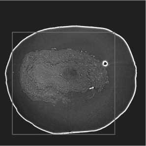 To decrease computational complexity and training time, expert-defined 864 X 864 regions of interest (ROIs) were extracted from each slice and used for model learning. An example of a slice with overlaid ROI is demonstrated in fig. 2 b .