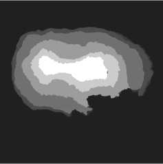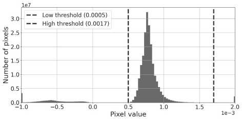 The intensity values on the slices ranges from -1.15 X 10-4 to 3 X 10-3. However, the diagnostically significant information in the slices is concentrated within a narrow subrange of brightness. To isolate the relevant signal from the noise and artifacts, we performed a preliminary linear normalization of the intensity values /. The acceptable range was defined by expert-selected thresholds, with a lower bound L = 5 X 10-4 and an upper bound U = 1.7 X 10-3.
