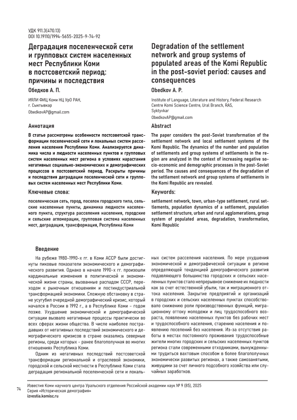 Текст научной статьи Деградация поcеленческой cети и групповых cиcтем наcеленных меcт Реcпублики Коми в поcтcоветcкий период: причины и поcледcтвия