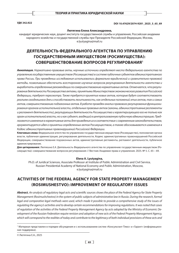 Нормативно-правовые акты, научные источники определяют место Федерального агентства по управлению государственным имуществом (Росимущества) в системе публичных субъектов административного права России. При проведении исследования использовались формально-юридический и сравнительно-правовой методы, позволившие обеспечить всестороннее изучение вопросов регулирования деятельности агентства и выработать определенные рекомендации по совершенствованию нормативных актов. Отмечается, что регулирование деятельности Росимущества актами, принятыми Министерством экономического развития Российской Федерации, требуют пересмотра. Также требуется принятие новых актов, которые будут соответствовать реалиям сегодняшнего дня и способствовать легитимности, как отдельных положений этих актов, так и самих актов, совершенствованию подзаконных актов. В работе проведен анализ правового регулирования функционирования органов исполнительной власти, отдельных правовых актов (законы, административные регламенты и регламент деятельности), регулирующих деятельность Росимущества и характеризующего его не только как орган исполнительной власти, но и как субъект, входящий в централизованную публичную администрацию. Предлагаются изменения в нормативные акты для приведения их в соответствие с современным законодательством, аргументируется идея о принятии определенных актов Росимуществом, а также обосновываются изменения в Кодекс административных правонарушений Российской Федерации.