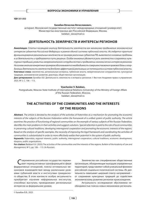 Статья посвящена анализу деятельности землячеств как механизма продвижения экономических интересов субъектов Российской Федерации в рамках единой системы публичной власти. Исследуется практика функционирования региональных землячеств на примере различных субъектов РФ, выявляются основные проблемы в их деятельности и предлагаются пути решения. Особое внимание уделяется роли землячеств в сохранении культурных традиций, развитии межрегионального сотрудничества и продвижении экономических интересов регионов. На основе анализа конкретных примеров обосновывается необходимость совершенствования правовой базы и координации деятельности землячеств для более эффективной реализации их потенциала в системе публичной власти.