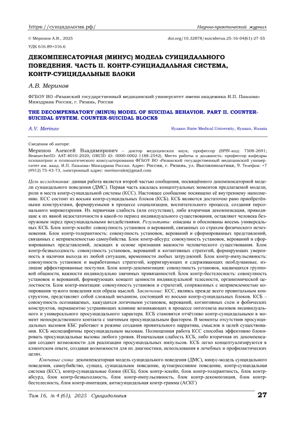 Цель исследования: данная работа является второй частью сообщения, посвящённого декомпенсаторной модели суицидального поведения (ДМС). Первая часть касалась концептуальных моментов предлагаемой модели, роли и места контр-суицидальной системы (КСС). Настоящее сообщение посвящено её внутреннему наполнению. КСС состоит из восьми контр-суицидальных блоков (КСБ). КСБ являются достаточно рано приобретёнными конструктами, формируемыми в процессе социализации, воспитательного процесса, создания персонального мировоззрения. Их первичная слабость (или отсутствие), либо вторичная декомпенсация, приводящие к их явной недостаточности в какой-то период индивидуального существования, оставляют человека безоружным перед просуицидальными воздействиями. Результаты: описаны и обоснованы восемь универсальных КСБ. Блок контр-эскейп: совокупность установок и верований, связанных со страхом физического исчезновения. Блок контр-толерантность: совокупность установок, верований и сформированных представлений, связанных с неприемлемостью самоубийства. Блок контр-абсурд: совокупность установок, верований и сформированных представлений, лежащих в основе признания важности человеческого существования. Блок контр-безвыходность: совокупность установок, верований и когнитивных стратегий, формирующих уверенность в наличии выхода из любой ситуации, временности любых затруднений. Блок контр-импульсивность: совокупность установок и выработанных стратегий, корригирующих и сдерживающих необдуманные, излишне аффектированные поступки. Блок контр-декомпозиция: совокупность установок, касающихся групповой общности, важности индивидуально значимых привязанностей. Блок контр-бестелесность: совокупность установок и верований, формирующих концепт ценности индивидуальной телесности, организмической целостности. Блок контр-имитация: совокупность установок и стратегий, сопряженных с неприемлемостью копирования чужого поведения или образа мыслей. Заключение: КСС, являясь прежде всего провитальным конструктом, представляет собой сложный механизм, состоящий из восьми контр-суицидальных блоков. КСБ – совокупность осознаваемых, кажущихся логичными установок, верований, когнитивных схем и фобических конструктов, перманентно устраняющих влияние возникающих в процессе онтогенеза вызовов индивидуального и универсального просуицидального характера. КСБ становятся отчётливо контр-суицидальными в момент непосредственного контакта с значимым просуицидальным фактором. В моменты отсутствия просуицидальных вызовов КБС работают в режиме создания провитального нарратива, смыслов и целей существования. КСБ неспецифичны просуицидальным вызовам. Полноценная работа КСС способна эффективно блокировать просуицидальные вызовы любого уровня. Изначальная слабость КСБ, либо вторичная их декомпенсация создают возможности для реализации просуицидальных импульсов. КСБ легко концептуализируются в клиентском опыте, создавая возможности для их диагностики, использования в лечебных и профилактических целях.