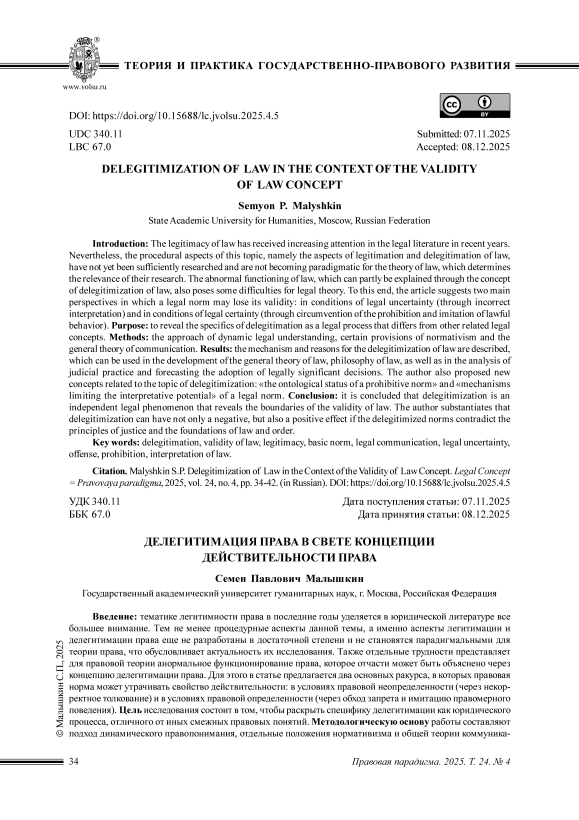 Введение: тематике легитимности права в последние годы уделяется в юридической литературе все большее внимание. Тем не менее процедурные аспекты данной темы, а именно аспекты легитимации и делегитимации права еще не разработаны в достаточной степени и не становятся парадигмальными для теории права, что обусловливает актуальность их исследования. Также отдельные трудности представляет для правовой теории анормальное функционирование права, которое отчасти может быть объяснено через концепцию делегитимации права. Для этого в статье предлагается два основных ракурса, в которых правовая норма может утрачивать свойство действительности: в условиях правовой неопределенности (через некорректное толкование) и в условиях правовой определенности (через обход запрета и имитацию правомерного поведения). Цель исследования состоит в том, чтобы раскрыть специфику делегитимации как юридического процесса, отличного от иных смежных правовых понятий. Методологическую основу работы составляют подход динамического правопонимания, отдельные положения нормативизма и общей теории коммуникации. В результате описаны механизм и причины делегитимации права, которые могут быть использованы в развитие общей теории права, философии права, а также при анализе судебной практики и прогнозировании принятия юридически значимых решений. Также в работе были предложены новые связанные с темой делегитимации концепты: «онтологический статус запретительной нормы» и «механизмы, ограничивающие интерпретационный потенциал» правовой нормы. В заключение делается вывод, что делегитимация представляет собой самостоятельное юридическое явление, выявляющее границы действительности права. В статье обосновывается, что делегитимация может иметь не только негативный, но и позитивный эффект, если делегитимируемые нормы противоречат принципам справедливости и основам правопорядка.