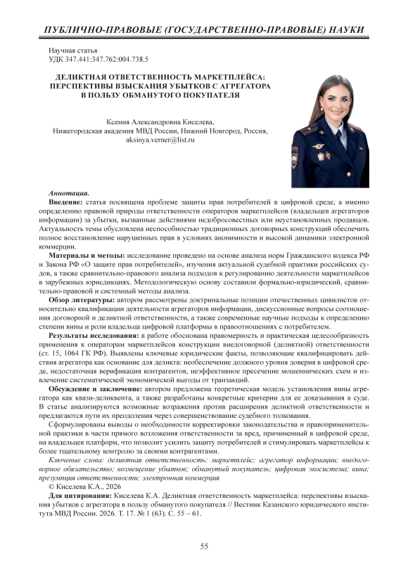 Введение: статья посвящена проблеме защиты прав потребителей в цифровой среде, а именно определению правовой природы ответственности операторов маркетплейсов (владельцев агрегаторов информации) за убытки, вызванные действиями недобросовестных или неустановленных продавцов. Актуальность темы обусловлена неспособностью традиционных договорных конструкций обеспечить полное восстановление нарушенных прав в условиях анонимности и высокой динамики электронной коммерции. Материалы и методы: исследование проведено на основе анализа норм Гражданского кодекса РФ и Закона РФ «О защите прав потребителей», изучения актуальной судебной практики российских судов, а также сравнительно-правового анализа подходов к регулированию деятельности маркетплейсов в зарубежных юрисдикциях. Методологическую основу составили формально-юридический, сравнительно-правовой и системный методы анализа. Обзор литературы: автором рассмотрены доктринальные позиции отечественных цивилистов относительно квалификации деятельности агрегаторов информации, дискуссионные вопросы соотношения договорной и деликтной ответственности, а также современные научные подходы к определению степени вины и роли владельца цифровой платформы в правоотношениях с потребителем. Результаты исследования: в работе обоснована правомерность и практическая целесообразность применения к операторам маркетплейсов конструкции внедоговорной (деликтной) ответственности (ст. 15, 1064 ГК РФ). Выявлены ключевые юридические факты, позволяющие квалифицировать действия агрегатора как основание для деликта: необеспечение должного уровня доверия в цифровой среде, недостаточная верификация контрагентов, неэффективное пресечение мошеннических схем и извлечение систематической экономической выгоды от транзакций. Обсуждение и заключение: автором предложена теоретическая модель установления вины агрегатора как квази-деликвента, а также разработаны конкретные критерии для ее доказывания в суде. В статье анализируются возможные возражения против расширения деликтной ответственности и предлагаются пути их преодоления через совершенствование судебного толкования. Сформулированы выводы о необходимости корректировки законодательства и правоприменительной практики в части прямого возложения ответственности за вред, причиненный в цифровой среде, на владельцев платформ, что позволит усилить защиту потребителей и стимулировать маркетплейсы к более тщательному контролю за своими контрагентами.