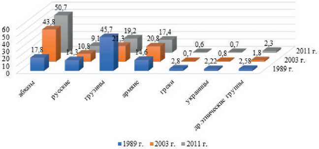 Абхазия была пестрой в этническом плане республикой, со значительными общинами русских, греков, евреев и др. Война привела к массовому исходу большей части грузинского и значительной части неабхазского населения (греков, русских, евреев и др.), коренным образом изменив демографическую ситуацию, сделав абхазов абсолютным большинством. По Всесоюзной переписи 1989 г. численность грузин составляла 239 872 чел. (45,7 %). В результате войны значительная их часть выехала из республики, и к 2003 г. их численность составила 44 041 чел. (21,3 %). Коренный этнос – абхазы – в 1989 г. составляли лишь 93 267 чел. (17,8 %), а к 2003 г. они уже являлись титульной нацией и насчитывали 94 597 чел. (43,8 %). К 2011 г. численность республики составила 243 958 чел., соответственно, количество абхазов достигло 50,7 %. Изменение численности всех других этнических групп представлено на рис. 1.
