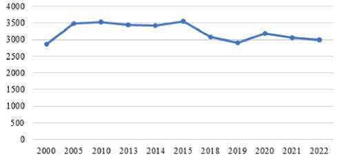 Доля лиц моложе трудоспособного возраста в 2003 г. составляла 18,8 %, трудоспособного – 55,3 %, старше трудоспособного – 25,9 %. С 2011 по 2023 г. на 1000 мужчин количество женщин стабильно превышает число мужчин в когорте 20–24 лет (20–24 – 8,2 %; 25–29 – 8,0 %; 30–34 – 7,5 %; 35–39 – 6,6 %; 40–44 – 6,6 %; 45–49 – 7,2 %; 50–54 – 7,4 %). Эта тенденция отражает изменения в возрастной структуре населения и соотношении полов в различных возрастных группах. Увеличение доли трудоспособного населения в период с 2003 по 2011 г. может быть связано с демографическими процессами, такими как повышение рождаемости в предыдущие годы и снижение смертности, что привело к увеличению численности людей в трудоспособном возрасте [25, 26].
