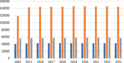 С 2016 по 2023 г. видим уменьшение доли моложе трудоспособного (17,2 %) и старше трудоспособного (23,5 %) возрастов, тогда как доля трудоспособного населения увеличилась до 59,2 %, гендерный дисбаланс заметен как в трудоспособном, так и в старше трудоспособном возрастах [21, с. 18]. Следует отметить, что в республике в долгожительском возрасте преобладают женщины.