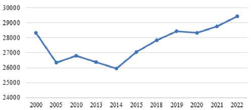 С 2010 по 2022 г. наблюдается резкий спад показателей рождаемости по республике (2,1 ‰ до –2,2 ‰) (рис. 5–7). Показатели естественного движения среди городского и сельского населения не утешительны. Среди городского населения с 2010 по 2022 г. естественный прирост понизился с 2,6 ‰ до –3,5 ‰, среди сельского – с 1,7 ‰ до