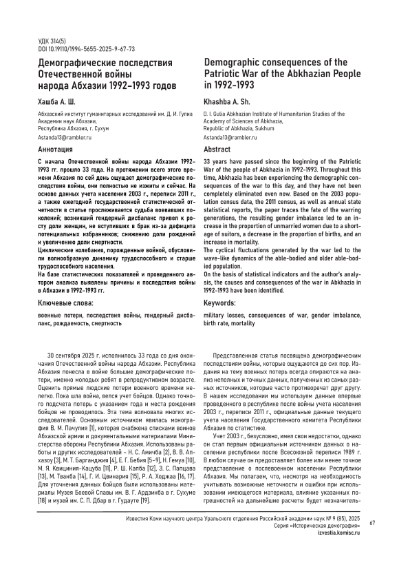 С начала Отечественной войны народа Абхазии 1992– 1993 гг. прошло 33 года. На протяжении всего этого времени Абхазия по сей день ощущает демографические последствия войны, они полностью не изжиты и сейчас. На основе данных учета населения 2003 г., переписи 2011 г., а также ежегодной государственной статистической отчетности в статье прослеживается судьба воевавших поколений; возникший гендерный дисбаланс привел к росту доли женщин, не вступивших в брак из-за дефицита потенциальных избранников; снижению доли рождений и увеличению доли смертности. Циклические колебания, порожденные войной, обусловили волнообразную динамику трудоспособного и старше трудоспособного населения. На базе статистических показателей и проведенного автором анализа выявлены причины и последствия войны в Абхазии в 1992–1993 гг.