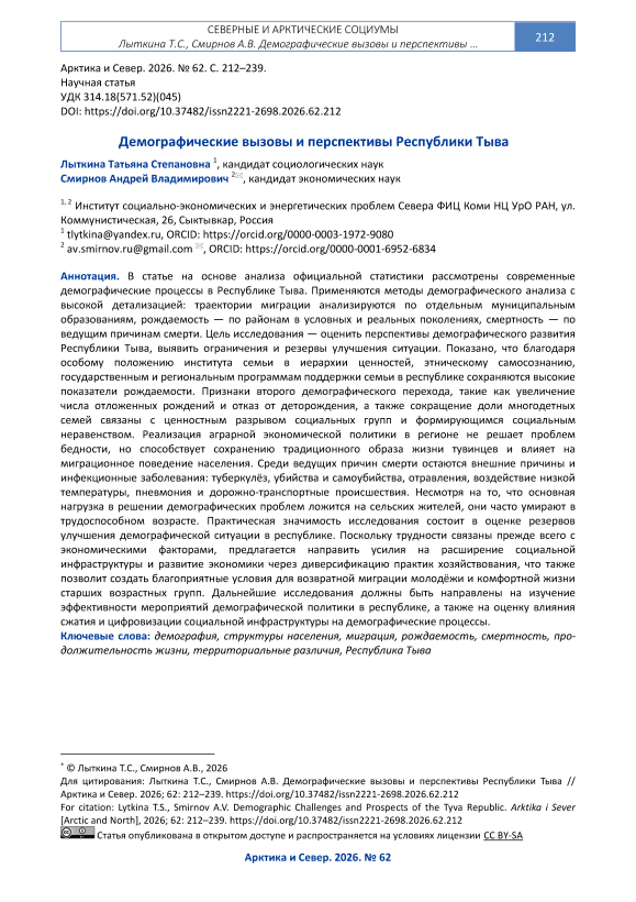 В статье на основе анализа официальной статистики рассмотрены современные демографические процессы в Республике Тыва. Применяются методы демографического анализа с высокой детализацией: траектории миграции анализируются по отдельным муниципальным образованиям, рождаемость — по районам в условных и реальных поколениях, смертность — по ведущим причинам смерти. Цель исследования — оценить перспективы демографического развития Республики Тыва, выявить ограничения и резервы улучшения ситуации. Показано, что благодаря особому положению института семьи в иерархии ценностей, этническому самосознанию, государственным и региональным программам поддержки семьи в республике сохраняются высокие показатели рождаемости. Признаки второго демографического перехода, такие как увеличение числа отложенных рождений и отказ от деторождения, а также сокращение доли многодетных семей связаны с ценностным разрывом социальных групп и формирующимся социальным неравенством. Реализация аграрной экономической политики в регионе не решает проблем бедности, но способствует сохранению традиционного образа жизни тувинцев и влияет на миграционное поведение населения. Среди ведущих причин смерти остаются внешние причины и инфекционные заболевания: туберкулёз, убийства и самоубийства, отравления, воздействие низкой температуры, пневмония и дорожно-транспортные происшествия. Несмотря на то, что основная нагрузка в решении демографических проблем ложится на сельских жителей, они часто умирают в трудоспособном возрасте. Практическая значимость исследования состоит в оценке резервов улучшения демографической ситуации в республике. Поскольку трудности связаны прежде всего с экономическими факторами, предлагается направить усилия на расширение социальной инфраструктуры и развитие экономики через диверсификацию практик хозяйствования, что также позволит создать благоприятные условия для возвратной миграции молодёжи и комфортной жизни старших возрастных групп. Дальнейшие исследования должны быть направлены на изучение эффективности мероприятий демографической политики в республике, а также на оценку влияния сжатия и цифровизации социальной инфраструктуры на демографические процессы.