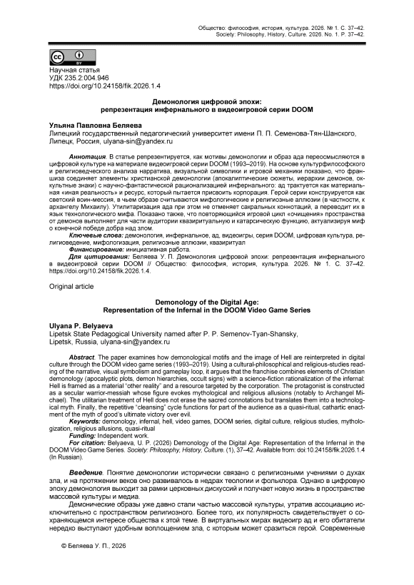 В статье репрезентируется, как мотивы демонологии и образ ада переосмысляются в цифровой культуре на материале видеоигровой серии DOOM(1993–2019). На основе культурфилософского и религиоведческого анализа нарратива, визуальной символики и игровой механики показано, что франшиза соединяет элементы христианской демонологии (апокалиптические сюжеты, иерархии демонов, оккультные знаки) с научно-фантастической рационализацией инфернального: ад трактуется как материальная «иная реальность» и ресурс, который пытается присвоить корпорация. Герой серии конструируется как светский воин-мессия, в чьем образе считываются мифологические и религиозные аллюзии (в частности, к архангелу Михаилу). Утилитаризация ада при этом не отменяет сакральных коннотаций, а переводит их в язык технологического мифа. Показано также, что повторяющийся игровой цикл «очищения» пространства от демонов выполняет для части аудитории квазиритуальную и катарсическую функцию, актуализируя миф о конечной победе добра над злом.