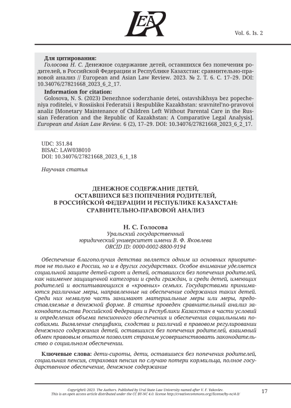 ДЕНЕЖНОЕ СОДЕРЖАНИЕ ДЕТЕЙ, ОСТАВШИХСЯ БЕЗ ПОПЕЧЕНИЯ РОДИТЕЛЕЙ, В РОССИЙСКОЙ ФЕДЕРАЦИИ И РЕСПУБЛИКЕ КАЗАХСТАН: СРАВНИТЕЛЬНО-ПРАВОВОЙ АНАЛИЗ