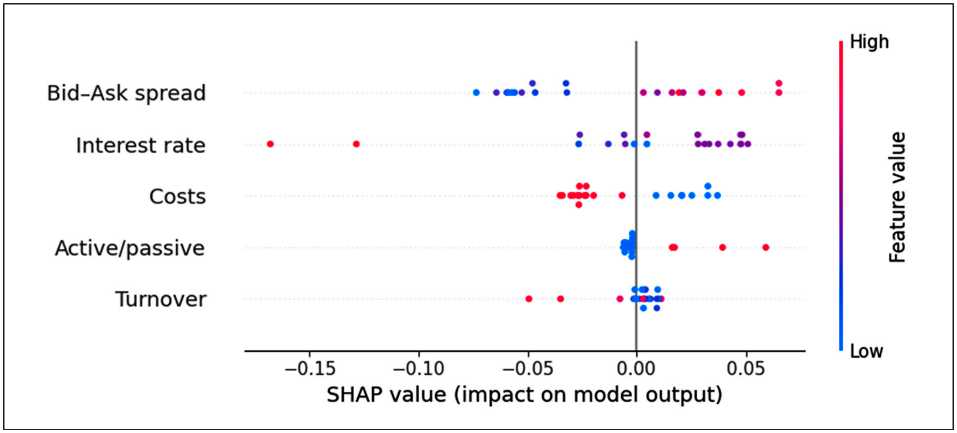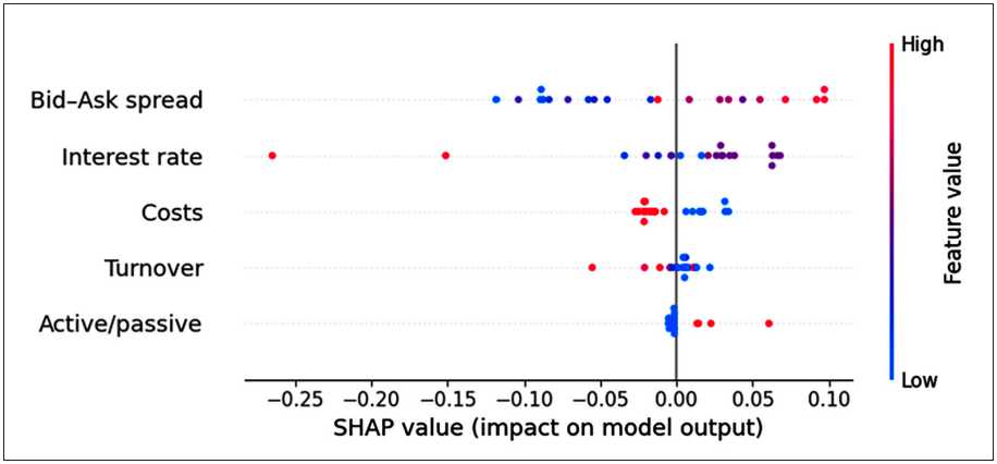 Интерпретация результатов на основе анализа важности признаков с применением SHAP-методологии выявила высокую согласованность ключевых факторов, определяющих динамику доходности ETF. Cпред bidask подтвердил статус наиболее значимой и устойчиво положительной детерминанты доходности. Процентная ставка характеризуется выраженным нелинейным эффектом: при экстремально высоких и низких значениях ее влияние на доходность носит отрицательный характер, тогда как умеренный уровень ставки ассоциирован с повышением доходности. Коэффициент расходов демон- стрирует стабильную отрицательную связь с результативностью ETF, что соответствует теоретическим представлениям о снижении чистой доходности инвестора вследствие издержек фонда. При этом гипотезы о статистически значимом негативном влиянии оборачиваемости портфеля и о положительном влиянии активного управления на доходность ETF в рамках рассматриваемой выборки подтверждения не получили: вклад данных факторов в предиктивную модель оказался пренебрежимо малым.