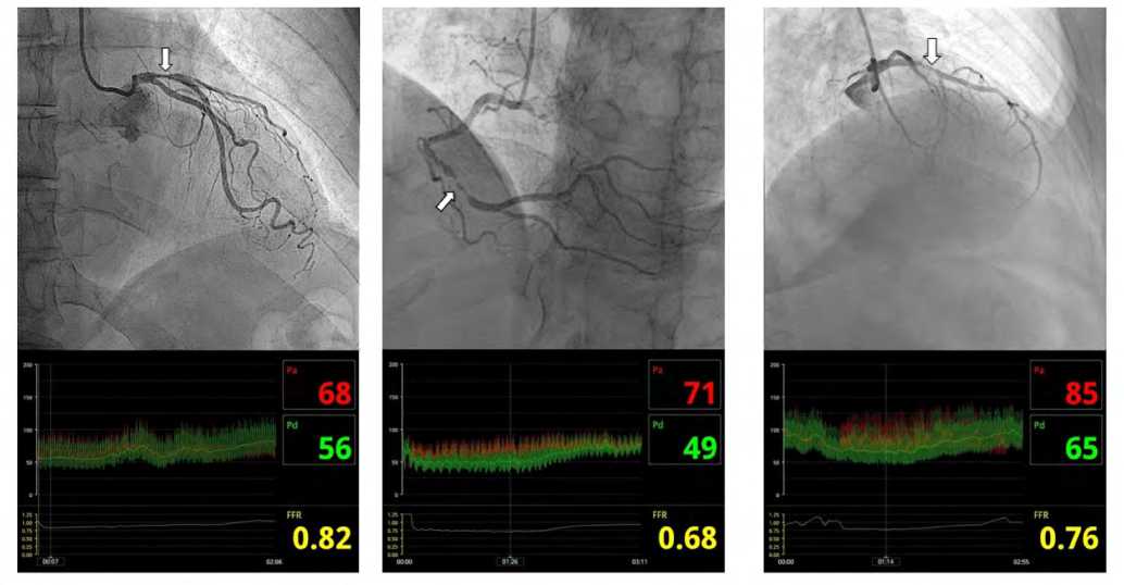 Рис. 1. Результаты ангиографического обследования с измерением фракционного резерва кровотока у пациентов с ишемической болезнью сердца (собственные результаты, пояснения в тексте)