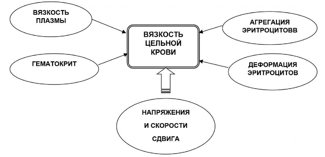 мореологии и в значительной степени определяет сопротивление кровотоку [24], особенно на уровне регионарного кровотока и микроциркуляции [25]. Текучесть крови и ее кислородтранспортный потенциал зависят от комплекса факторов, таких как вязкость плазмы, гематокрит, деформируемость, агрегация эритроцитов и сдвиговые условия (рис. 2).
