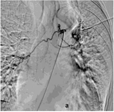 Комплексная диагностика и раннее выявление источника кровотечения путём ангиографии имеют решающее значение. ЭБА, даже при массивном кровохарканье, имеет эффективность в 90% случаев [3, 27–29]. Согласно нашим данным, ЭБА была радикальным методом лечения в 89,9% случаев, в 10% случаев были небронхиальные артерии, потребовавшие детального ангиографического поиска и дополнительных эмболизаций.