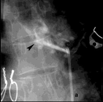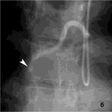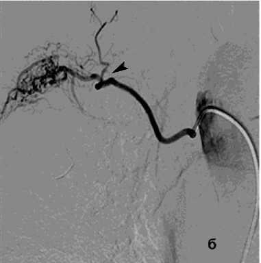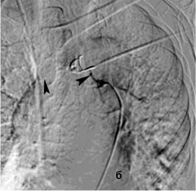 Рисунок 6. Ангиограмма БА у пациента с опухолью заднего средостения и прорастанием лёгкого, ЛК2Б: а – извитость и усиление лёгочного рисунка; б – состояние после эмболизации – окклюзия БА