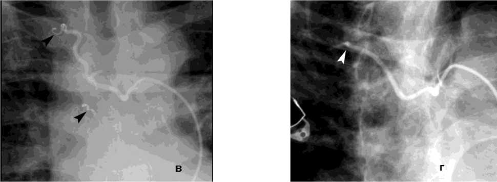 Предполагаемые источники кровотечения эм-болизированы с помощью микросфер, желатиновых губок и спиралей (рис. 8, а, б). Комбинированное применение эндобронхиальной тампонады с эмболизацией бронхиальных артерий выполнено у 13 (8,7%) пациентов и позволило во всех случаях добиться прекращения поступления крови в трахеобронхиальное дерево и избежать асфиксии (рис. 8, в, г).