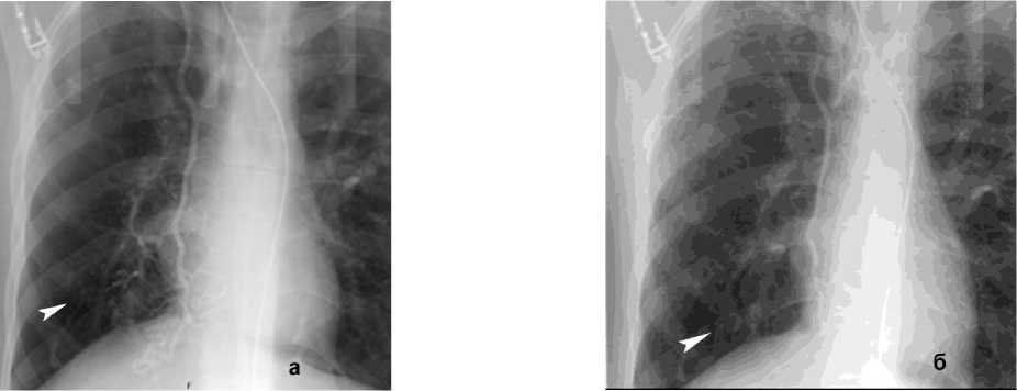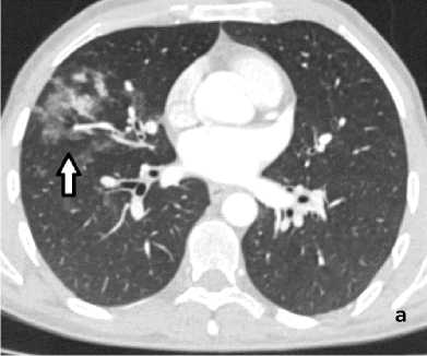 Рисунок 4. КТ грудной клетки с болюсным КУ (артериальная фаза), аксиальные срезы: а (лёгочный режим) – геморрагическое пропитывание в средней доле правого лёгкого (стрелка); б (средостенный режим) – расширение и извитость бронхиальных артерий (сосудистая мальформация – стрелка)
