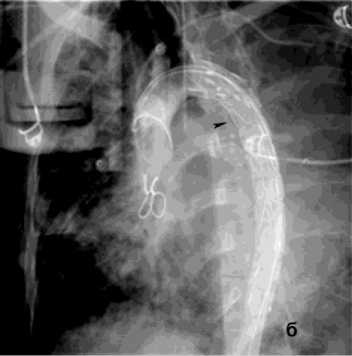 Рисунок 9. Аортография у пациента после трансплантации лёгких, ЛК 3Б: а – аорто-бронхиальный свищ с поступлением контраста в левый главный бронх; б – эндопротезирование нисходящего отдела аорты протезом Ankura TAA2622B160 – без признаков экстравазации