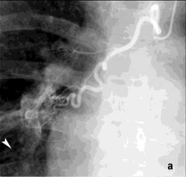 Рецидив ЛК после эмболизации наблюдался у 15 (10%) пациентов, в 3 случаях из них эмболизация БА была выполнена более года назад. В результате ангиографического поиска выявлены дополнительные источники ЛК: межреберные артерии – 4, внутренняя грудная артерия – 8 (рис. 8), АV – 3 (рис. 7).