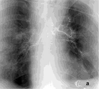 ЛК при раке лёгкого наблюдалось в 43 случаях (28,5%), ангиографические изменения при этой патологии зависят от локализации опухоли, её распространённости и возникших осложнений [9]. При центральном раке лёгкого кровоснабжение обеднено, но наблюдается умеренная периферическая гиперваскуляризация, которая может появляться при развитии обструктивного пневмонита. Наиболее достоверным ангиографическим симптомом, независимо от варианта кровоснабжения опухоли, является фрагментация периферических ветвей БА.