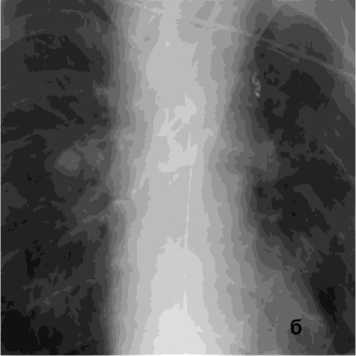 Преимущественно это были пациенты, имевшие ЛК 1А – 103 (69,25%) случая – с разнообразной патологией (табл. 1), ЛК 1Б – 20 (13,6%), ЛК 1В – 2 (1,3%). В этой группе превалировала бронхоэктатическая болезнь, ТБЦ в анамнезе, рак лёгких, саркоидоз, инфекционные поражения лёгких, эхинококк (рис. 3). Причиной ЛК 2А послужили у 14 (9,3%) пациентов рак лёгкого, пневмонии после Сovid-инфекции (рис. 4, а), включая и поражение бронхов, язвенный бронхит, состояние после АКШ, опухоль средостения (рис. 6), ЛК неясной этиологии, ЛК 3А и ЛК 3Б соответственно составляли 3 (2,1%) и 2 (1,3%) случая, причиной были бронхоэктатическая болезнь, в анамнезе перенесённые ТБЦ, аорто-бронхиальное соустье (табл. 1).