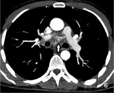 КТ исследования грудной клетки были выполнены по стандартной методике с внутривенным болюсным контрастным усилением (КУ). Область сканирования – от уровня верхней аппертуры грудной клетки до задних рёберно-диафрагмальных синусов. Исследование проводили на высоте спокойного вдоха при полностью задержанном дыхании. После нативного сканирования выполнялось внут- ривенное болюсное КУ с проведением артериальной, венозной и отсроченной фаз.