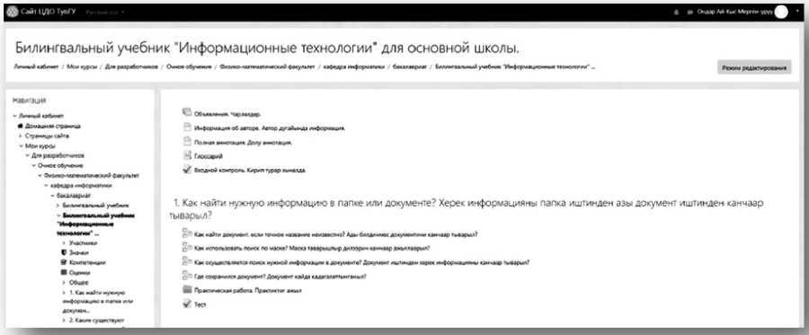 Для проведения исследований в реальном учебном процессе был разработан электронный учебник по дисциплине «Информационные технологии», предназначенный для обучающих-би-лингвов с параллельным использованием русского и тувинского языков. Учебник разработан на основе содержания действующих учебников по дисциплине «Информационные технологии» и учитывает вышеобозначенные особенности билингвального мышления и дидактические принципы.
