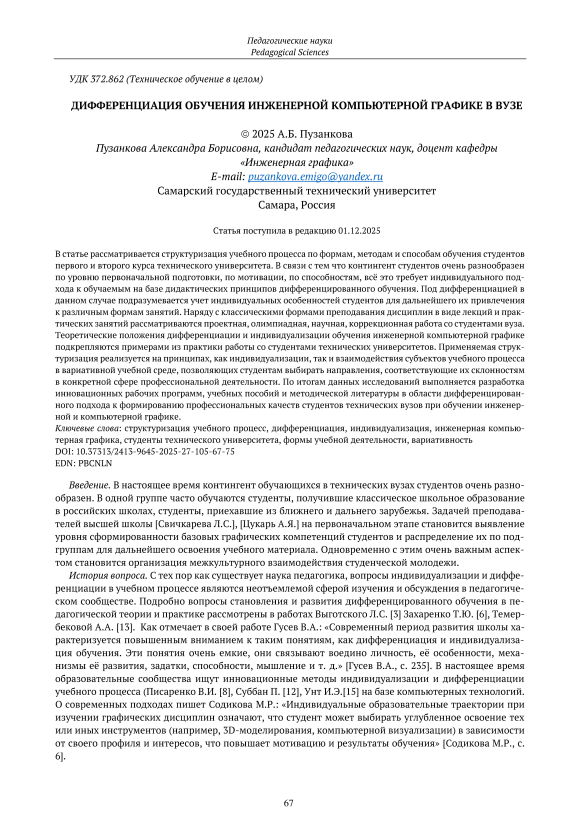 В статье рассматривается структуризация учебного процесса по формам, методам и способам обучения студентов первого и второго курса технического университета. В связи с тем что контингент студентов очень разнообразен по уровню первоначальной подготовки, по мотивации, по способностям, всё это требует индивидуального подхода к обучаемым на базе дидактических принципов дифференцированного обучения. Под дифференциацией в данном случае подразумевается учет индивидуальных особенностей студентов для дальнейшего их привлечения к различным формам занятий. Наряду с классическими формами преподавания дисциплин в виде лекций и практических занятий рассматриваются проектная, олимпиадная, научная, коррекционная работа со студентами вуза. Теоретические положения дифференциации и индивидуализации обучения инженерной компьютерной графике подкрепляются примерами из практики работы со студентами технических университетов. Применяемая структуризация реализуется на принципах, как индивидуализации, так и взаимодействия субъектов учебного процесса в вариативной учебной среде, позволяющих студентам выбирать направления, соответствующие их склонностям в конкретной сфере профессиональной деятельности. По итогам данных исследований выполняется разработка инновационных рабочих программ, учебных пособий и методической литературы в области дифференцированного подхода к формированию профессиональных качеств студентов технических вузов при обучении инженерной и компьютерной графике.