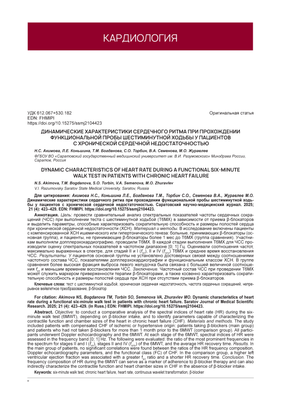 Цель: провести сравнительный анализ спектральных показателей частоты сердечных сокращений (ЧСС) при выполнении теста с шестиминутной ходьбой (Т6МХ) в зависимости от приема β-блокаторов и выделить параметры, способные характеризовать сократительную способность и размеры полостей сердца при хронической сердечной недостаточности (ХСН). Материал и методы. В исследование включены пациенты с компенсированной ХСН ишемического или гипертонического генеза: больные, принимающих β-блокаторы (основная группа), и пациенты, не принимающие β-блокаторы более 1 мес до Т6МХ (группа сравнения). Участникам выполняли допплерэхокардиографию, проводили Т6МХ. В каждой стадии выполнения Т6МХ для ЧСС производили оценку спектральных показателей в частотном диапазоне [0; 1] Гц. Оценивали соотношения частот, максимально выраженных в спектре, для стадий II и I (fII/I), II и IV (fII/IV) Т6МХ и среднее время восстановления ЧСС. Результаты. У пациентов основной группы не установлено достоверных связей между соотношениями частотного состава ЧСС, показателями допплерэхокардиографии и функциональным классом ХСН. В группе сравнения более высокая фракция выброса левого желудочка была связана с большей величиной соотношения fII/I и меньшим временем восстановления ЧСС. Заключение. Частотный состав ЧСС при проведении Т6МХ может служить маркером приверженности терапии β-блокаторами, а также косвенно характеризовать сократительную способность и размеры полостей сердца при ХСН при отсутствии приема β-блокаторов.