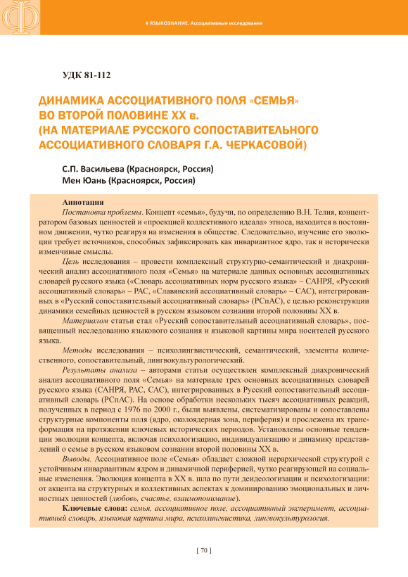 Statement of the problem. The concept of ‘family’, as defined by V.N. Telia, as a concentrator of basic values and a “projection of the collective ideal” of an ethnic group [Telia, 1996, p. 215], is in constant flux, sensitively responding to changes in society. Therefore, studying its evolution requires sources capable of capturing both its invariant core and its historically variable meanings. The purpose of this study is to conduct a comprehensive structural-semantic and diachronic analysis of the family associative field using data from the main associative dictionaries of the Russian language (the Dictionary of Associative Norms of the Russian Language – DANRL, the Russian Associative Dictionary – RAD, and the Slavic Associative Dictionary – SAD), integrated into the Russian Comparative Associative Dictionary (RCAD). This analysis aims to reconstruct the dynamics of family values in Russian linguistic consciousness in mid-to-late 20th century. The article draws on the Russian Comparative Associative Dictionary (RCAD), which studies the linguistic consciousness and linguistic worldview of native Russian speakers. Research methods include psycholinguistic, semantic, quantitative, comparative, and linguacultural methods. Research results. The authors conducted a comprehensive diachronic analysis of the family associative field using data from three main associative dictionaries of the Russian language (DANRL, RAD, SAD), integrated into the Russian Comparative Associative Dictionary (RCAD). Based on the processing of several thousand associative responses obtained between 1967 and 2000, the structural components of the field (core, near-core zone, periphery) were identified, systematized, and compared, and their transformation was traced across key historical periods. Key trends in the evolution of the concept were identified, including psychologization, individualization, and the dynamics of ideas about family in Russian linguistic consciousness in mid-to-late 20th century. Conclusions. The family associative field has a complex hierarchical structure with a stable, invariant core and a dynamic periphery that is sensitive to social change. The evolution of the concept in the 20th century followed the path of de-ideologization and psychologization: from an emphasis on structural and collective aspects to the dominance of emotional and personal values (love, happiness, mutual understanding).