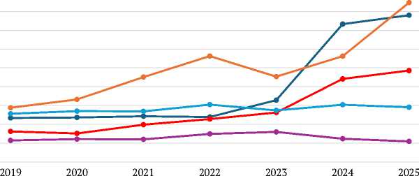 Цены на растительные масла (по индексу цен на растительные масла ФАО) после резкого роста в 2021–2022 г. снизились в 2023 г., а затем начали устойчивый рост, выводящий их на уровень, заметно превышающий докризисный. В 2025 г. по сравнению с 2004 г. прирост цен составил 17,1%, а по отношению к уровню 2019 г. цены выросли фактически вдвое (+94,2%).