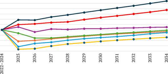 На горизонте до 2034 г. в OECD-FAO Agricultural Outlook прогнозируется, что цены на большинство продовольственных товаров не выйдут за пределы средних цен 2022–2024 гг. или будут находиться вблизи них. Исключение составляют растительные масла и сухое молоко, цены на которые составят 118,7% и 127,1% соответственно от базового уровня. Следует учесть, что прогноз OECD-FAO Agricultural Outlook составляется в номинальных долларах США, что означает отрицательную или нейтральную динамику реальных цен на продовольственные товары в долгосрочном периоде.