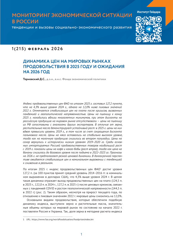 Текст научной статьи Динамика цен на мировых рынках продовольствия в 2025 году и ожидания на 2026 год