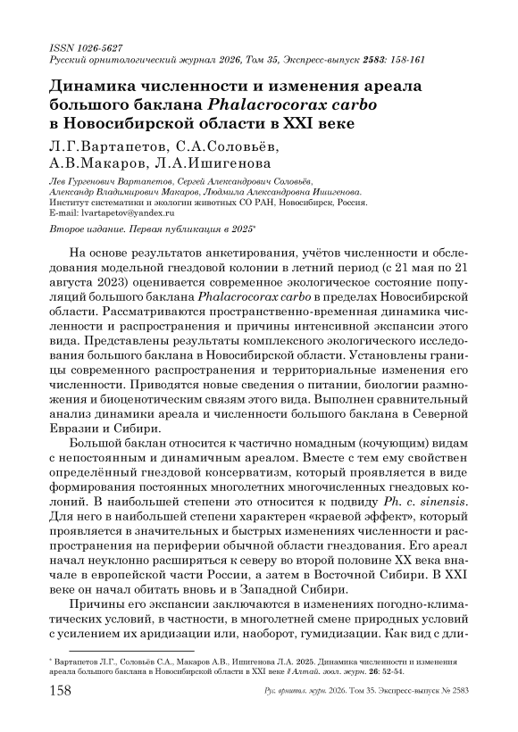 На основе результатов анкетирования, учётов численности и обследования модельной гнездовой колонии в летний период (с 21 мая по 21 августа 2023) оценивается современное экологическое состояние популяций большого баклана Phalacrocorax carbo в пределах Новосибирской области. Рассматриваются пространственно-временная динамика численности и распространения и причины интенсивной экспансии этого вида. Представлены результаты комплексного экологического исследования большого баклана в Новосибирской области. Установлены границы современного распространения и территориальные изменения его численности. Приводятся новые сведения о питании, биологии размножения и биоценотическим связям этого вида. Выполнен сравнительный анализ динамики ареала и численности большого баклана в Северной Евразии и Сибири.