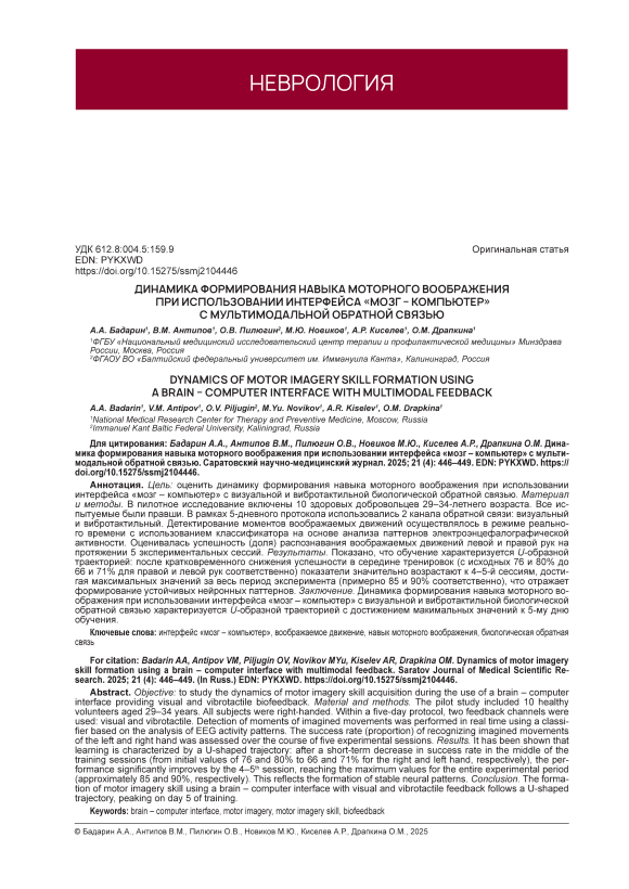 Цель: оценить динамику формирования навыка моторного воображения при использовании интерфейса «мозг – компьютер» с визуальной и вибротактильной биологической обратной связью. Материал и методы. В пилотное исследование включены 10 здоровых добровольцев 29–34-летнего возраста. Все испытуемые были правши. В рамках 5-дневного протокола использовались 2 канала обратной связи: визуальный и вибротактильный. Детектирование моментов воображаемых движений осуществлялось в режиме реального времени с использованием классификатора на основе анализа паттернов электроэнцефалографической активности. Оценивалась успешность (доля) распознавания воображаемых движений левой и правой рук на протяжении 5 экспериментальных сессий. Результаты. Показано, что обучение характеризуется U-образной траекторией: после кратковременного снижения успешности в середине тренировок (с исходных 76 и 80% до 66 и 71% для правой и левой рук соответственно) показатели значительно возрастают к 4–5-й сессиям, достигая максимальных значений за весь период эксперимента (примерно 85 и 90% соответственно), что отражает формирование устойчивых нейронных паттернов. Заключение. Динамика формирования навыка моторного воображения при использовании интерфейса «мозг – компьютер» с визуальной и вибротактильной биологической обратной связью характеризуется U-образной траекторией с достижением макимальных значений к 5-му дню обучения.