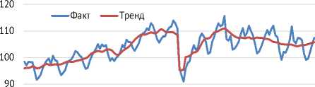 Рис. 1. Динамика индекса промышленного производства в 2014–2025 гг. (фактические данные и трендовая составляющая), % к среднегодовому значению 2016 г.