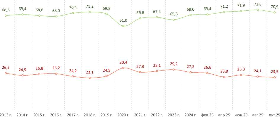 В октябре 2025 года прервалась позитивная тенденция роста доли положительных оценок социального настроения, которая наблюдалась с начала года. В августе – октябре их удельный вес составил 71–73%.