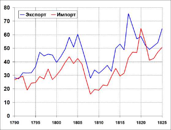 * Источник данных в ассигнационных рублях: 1790–1797 гг. [19, s. 2]; 1797–1815 гг. [1, табл. III]; 1816–1825 гг.: Государственная внешняя торговля [1816– 1825] года в разных ея видах. СПб., [1817–1826].