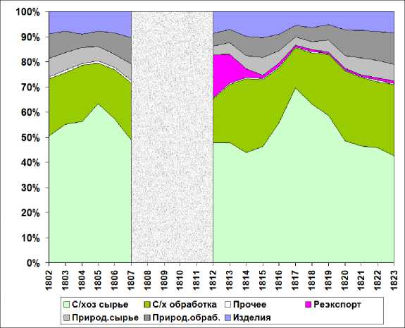 Рис. 2. Динамика структуры экспорта Российской империи, 1802– 1823 гг. (в процентах от общей стоимости экспорта) /