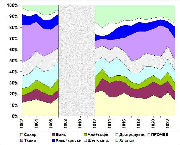 Рис. 3. Динамика структуры импорта Российской империи, 1802– 1823 гг. (в процентах от общей стоимости импорта)